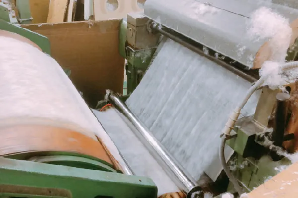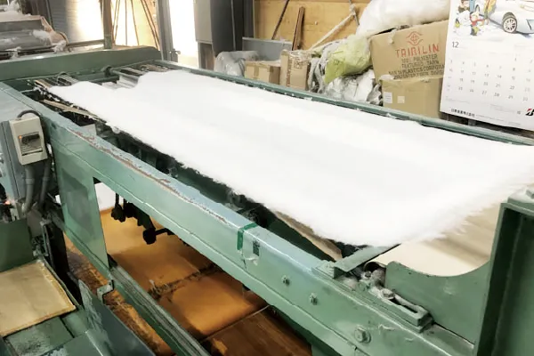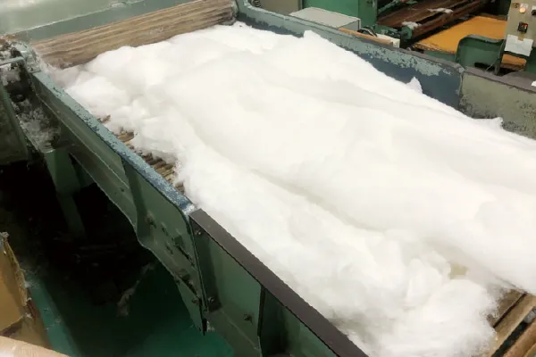 玉綿は、反毛わたを「カード機」と呼ばれる機械で繊維の方向を揃え、きめ細やかなシート状になった綿