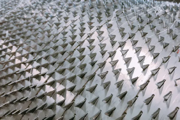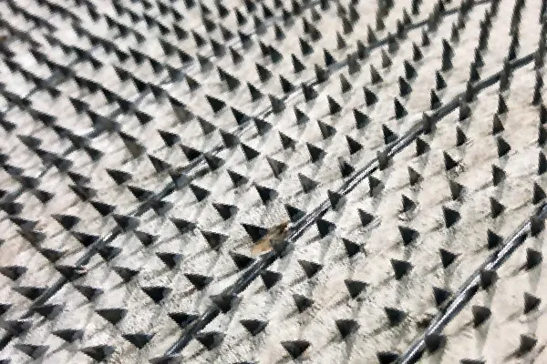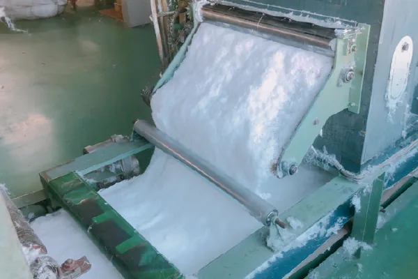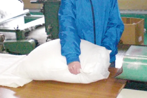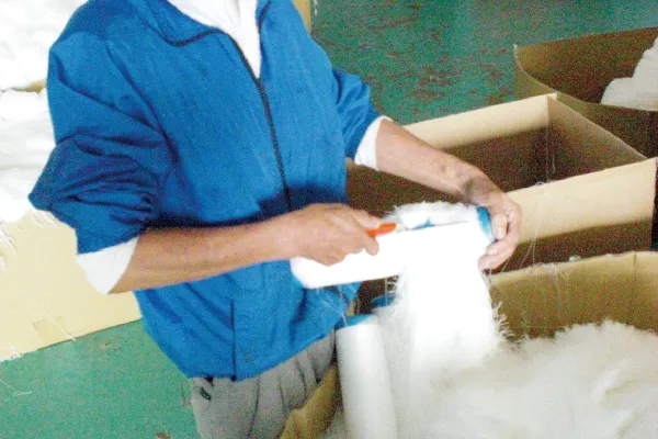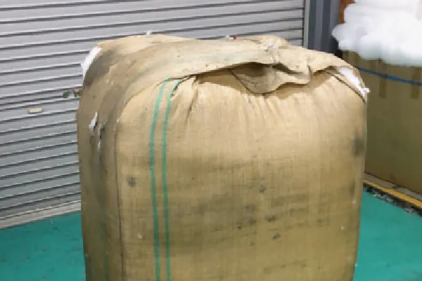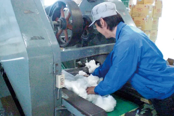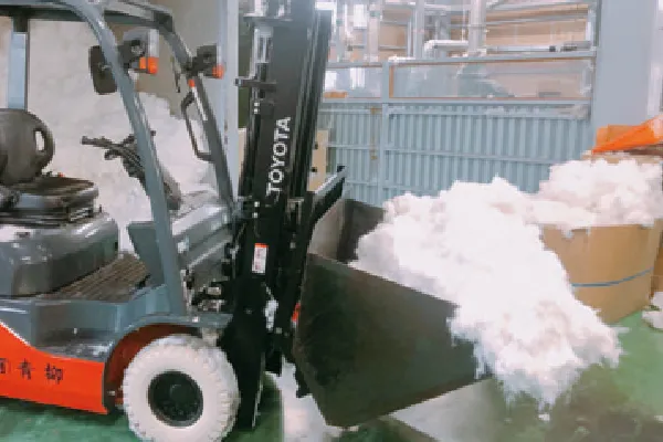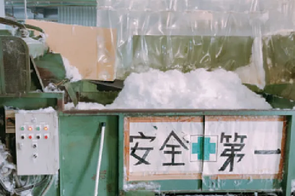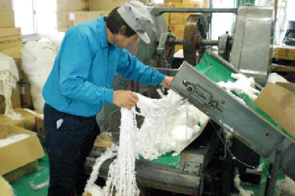 繊維・織物工場で発生した白い余り糸や生地のはぎれ等を回収・分別し、針が植えられたドラムの機械にかける事でわた状になります。そのわたの状態を「反毛わた」と呼びます。弊社の反毛わたは、製造過程で出る未使用の白いポリエステル素材を使用し、繊維密度の高い、底付き感の少ないの「わた」となります。