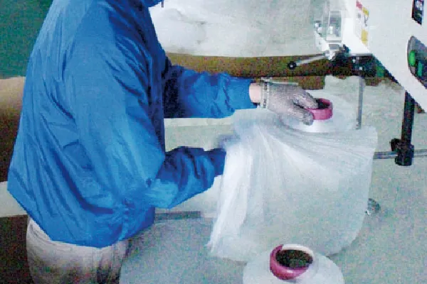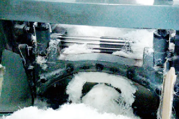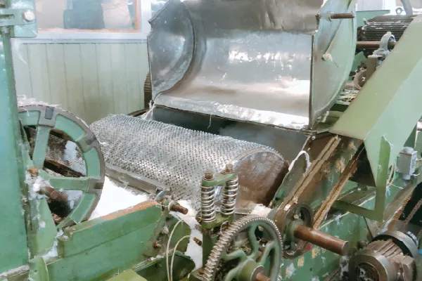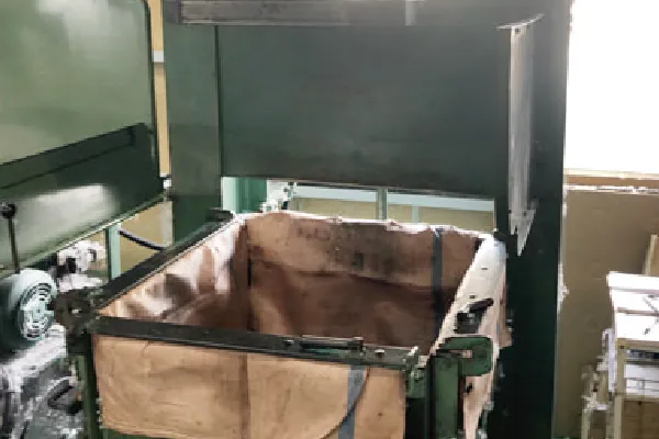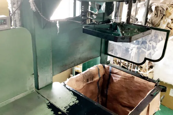 分別された糸や生地(原料)は反毛機にかけやすくする為、切断機で2・3cmのサイズにカットします。切断された原料はファンで混綿場と呼ばれる部屋へ送られ、一定量貯めた後、混ぜながらホッパーへ入れます。